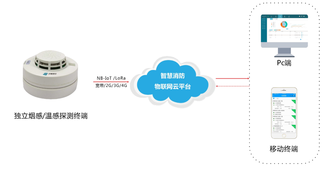 獨(dú)立煙感監(jiān)控系統(tǒng)由獨(dú)立式物聯(lián)網(wǎng)煙感報(bào)警器、監(jiān)控云平臺(tái)、手機(jī)APP組成。煙感設(shè)備各自獨(dú)立供電、互不影響,同時(shí)克服傳統(tǒng)獨(dú)立煙感無法聯(lián)網(wǎng)和聯(lián)網(wǎng)煙感布線麻煩的缺點(diǎn),獨(dú)立安裝,無線聯(lián)網(wǎng),大幅提高消防施工效率和智慧化水平。
